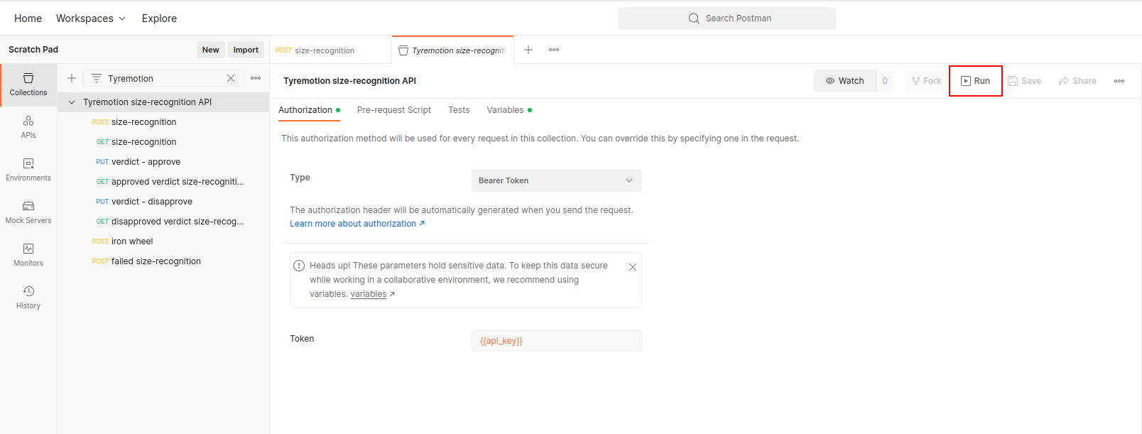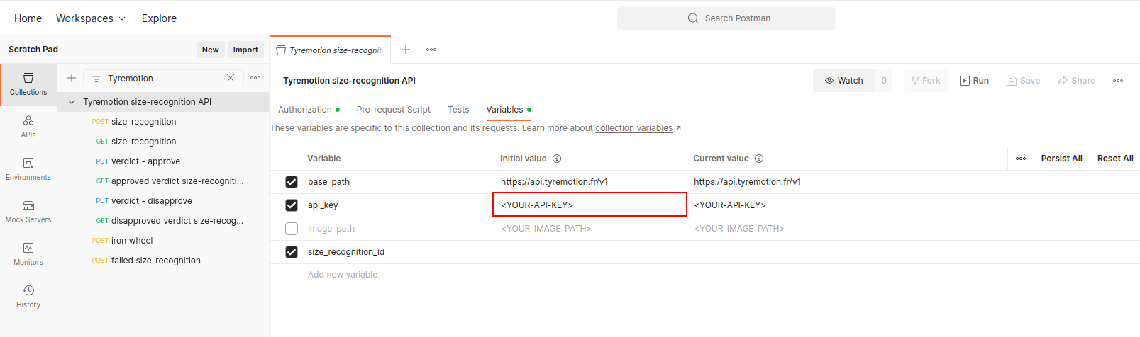 Before sending any request, you first need to set your API-KEY, otherwise your requests will be returned with a 401 Unauthorized HTTP status. You API key is set as a Collection variable. Click on the collection name and go to the Variables tab. Replace <YOUR-API-KEY> with your Tyremotion API Key.