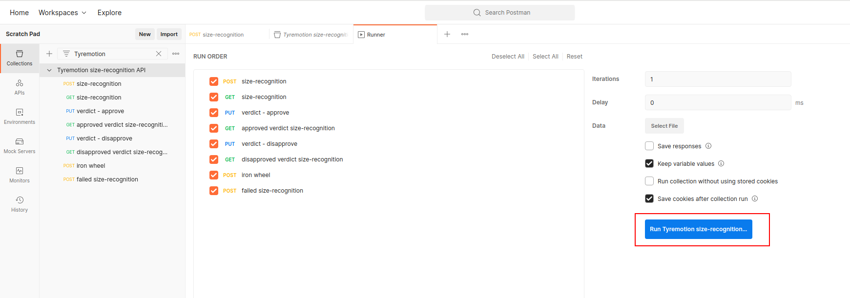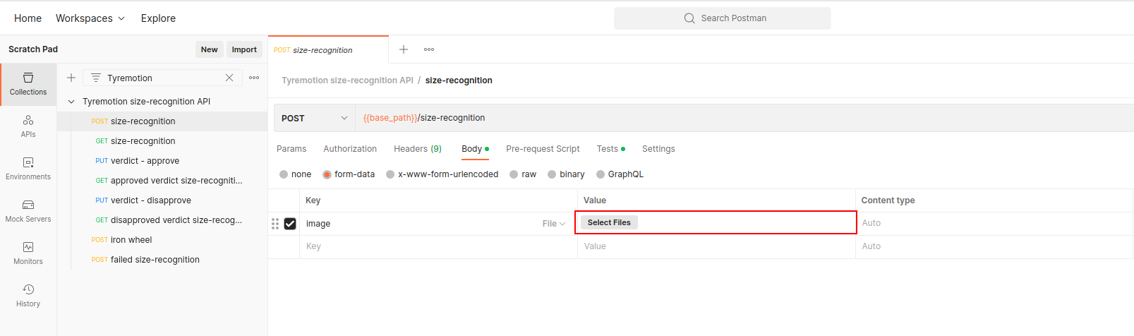 To be able to run the entire collection, you need to provide it with an input image. Click on the first request: POST size-recognition and in the Body tab, select a file as the value of the image key.